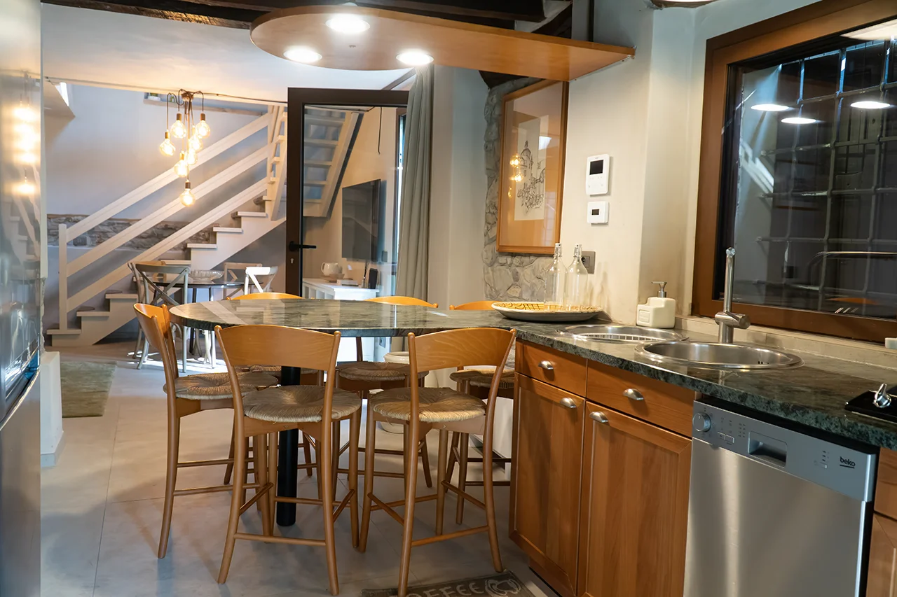 Questa affascinante soluzione su due livelli vanta una superficie di 37 metri quadrati al piano terra, dove troverai una cucina dotata di una elegante penisola, ideale per la preparazione di deliziose pietanze. Il soggiorno è arredato con gusto ed è arricchito da un comodo divano letto matrimoniale, perfetto per gli ospiti. Il tavolo da soggiorno e un pratico ripostiglio completano con stile il piano terra.